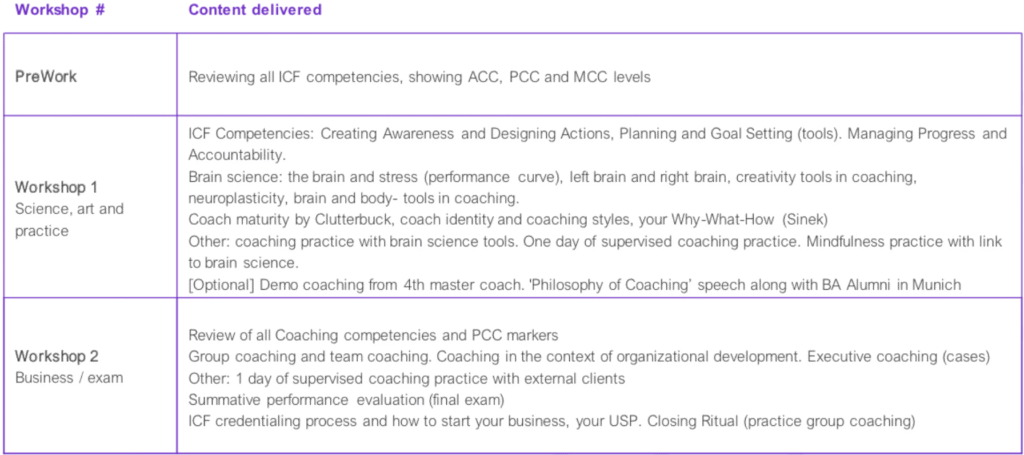 - Two 4-day in-person workshops on all 8 core coaching competencies, PCC markers, neuroscience and 3 full days of observed sessions